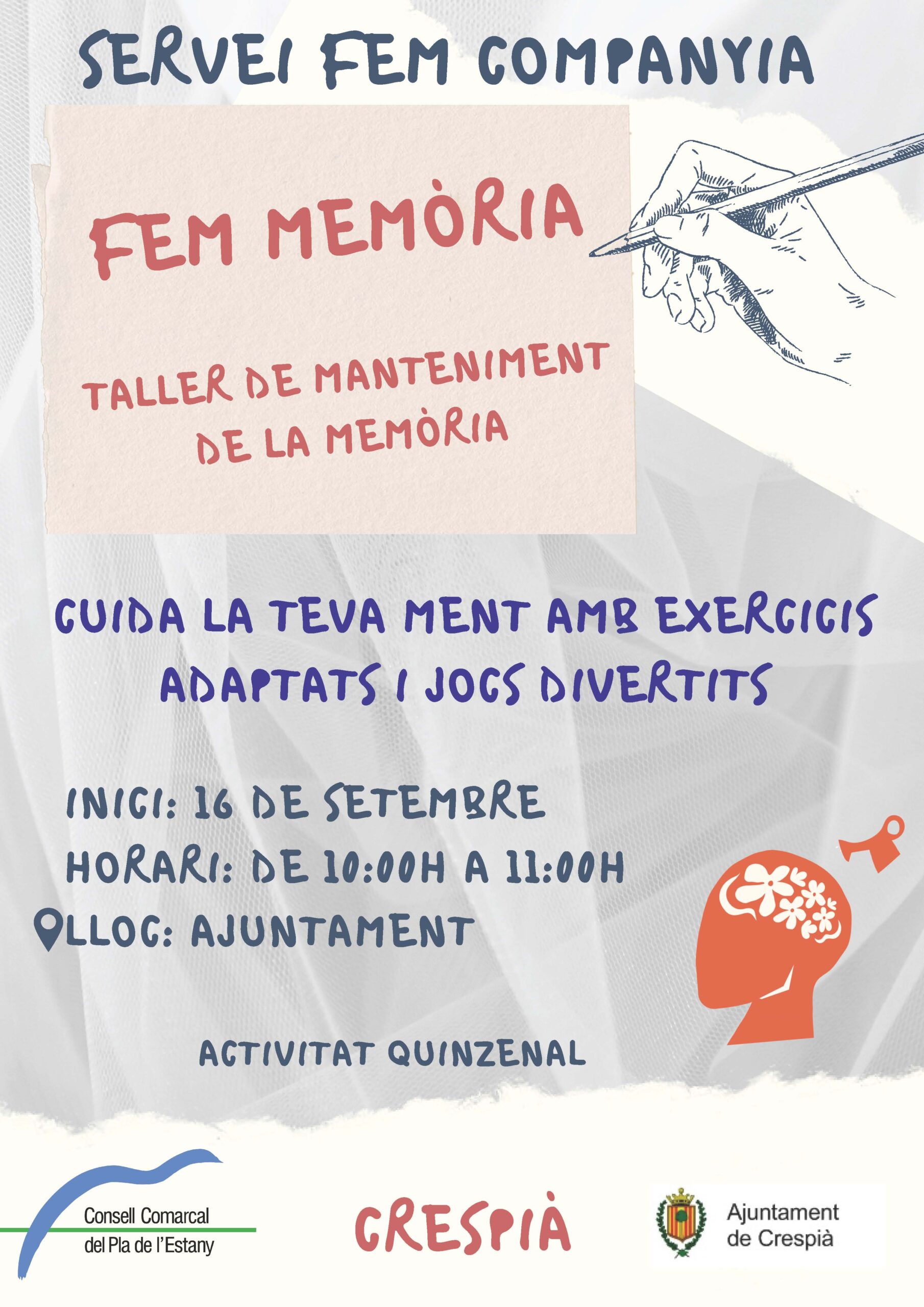 🧠✨ TALLER DE MEMÒRIA A CRESPIÀ Cuida la teva ment amb exercicis adaptats i jocs divertits! 📅 Inici: 16 de setembre⏰ Horari: de 10 a 11 h📍 Lloc: Ajuntament de Crespià📌 Activitat quinzenal Organitza: Servei Fem Companyia 💡 Una manera divertida i saludable de mantenir la memòria activa! Programa