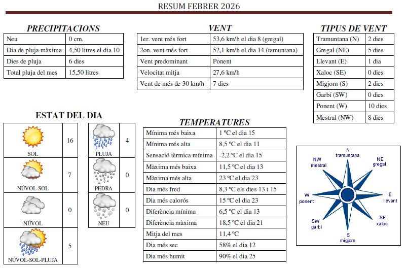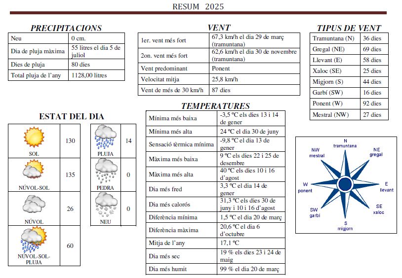 EL TEMPS AL MUNICIPI: (dades preses amb una estació “Oregon Scientific WMR200”, a partir del 01-01-2023, les dades són preses amb una estació “Uzoli FT0310”)