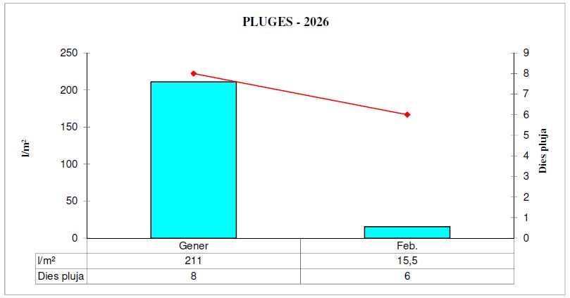 La pluja dels últims tres mesos ha estat de 475,00 l/m² (desembre = 252,50 – gener = 211,00 – febrer = 14,50 l/m²).
